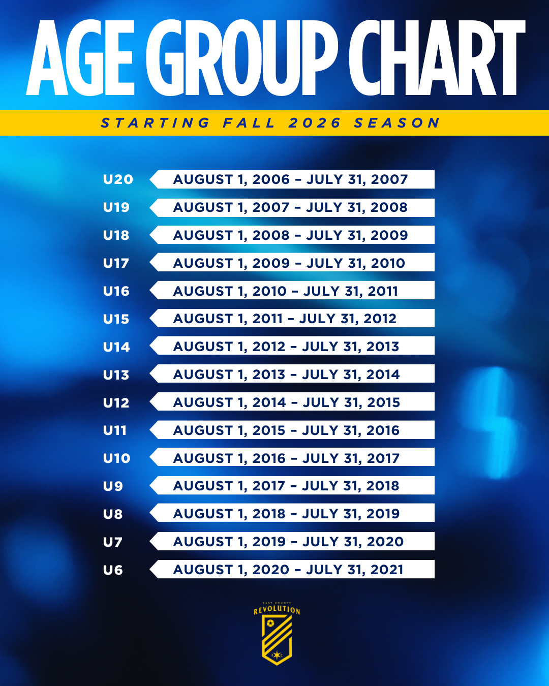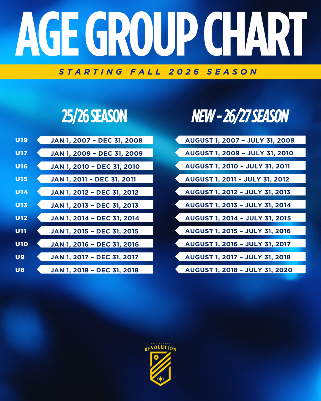 tStartingarting with the 2026-27 season, youth soccer will move from the current calendar year (January – December) model to a seasonal-year (August-July) model for age grouping.